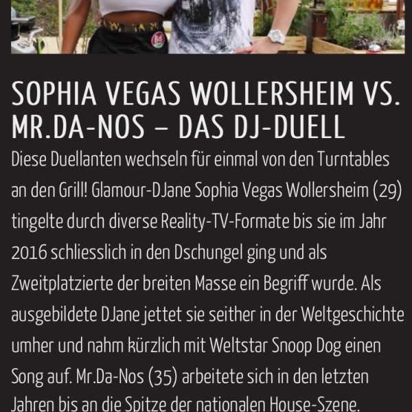 SOPHIA VEGAS WOLLERSHEIM VS. MR.DA-NOS – DAS DUELL Diese Duellanten wechseln für einmal von den Turntables an den Grill! Glamour-DJane Sophia Vegas Wollersheim (29) tingelte durch diverse Reality-TV-Formate bis sie […]…